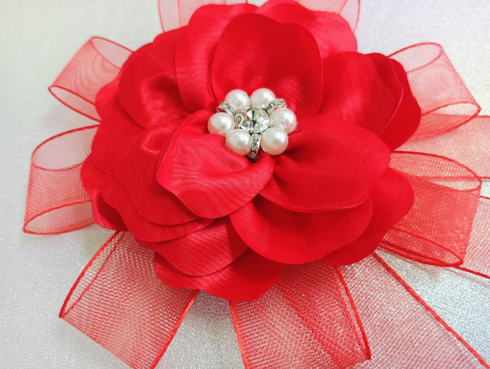 Изящен дизайн: Тази брошка (или аксесоар за коса) изработено от нежен текстил, украсено с център от сияещи кристали и класически перли. Комбинацията от материали придава луксозен и завършен вид.