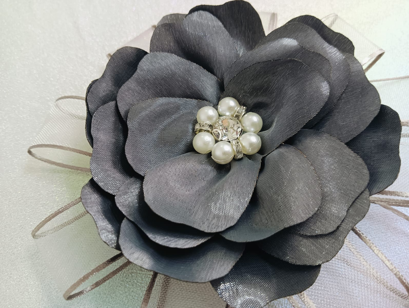 Изящен дизайн: Тази брошка (или аксесоар за коса) изработено от нежен текстил, украсено с център от сияещи кристали и класически перли. Комбинацията от материали придава луксозен и завършен вид.