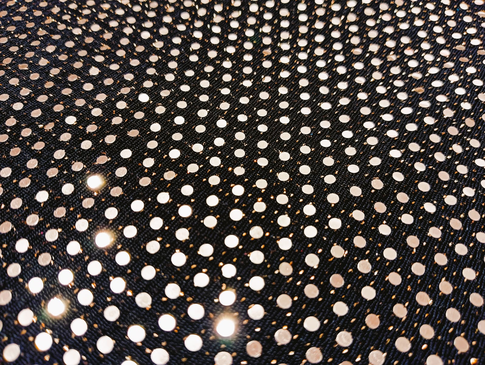плат с кръгли пайети, монтирани върху черна еластична основа ликра и спандекс.