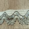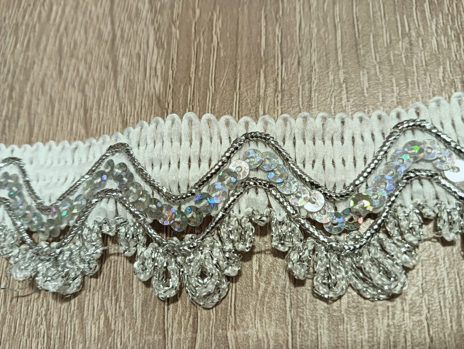 Тази изискана декоративна гарнитура комбинира бяла текстилна основа с богато украсен сребрист мотив. Вълнообразната дантела е очертана със сребрист конец, а вътрешността ѝ е изпълнена с плътно подредени холограмни пайети, които придават интензивен, преливащ блясък.
