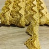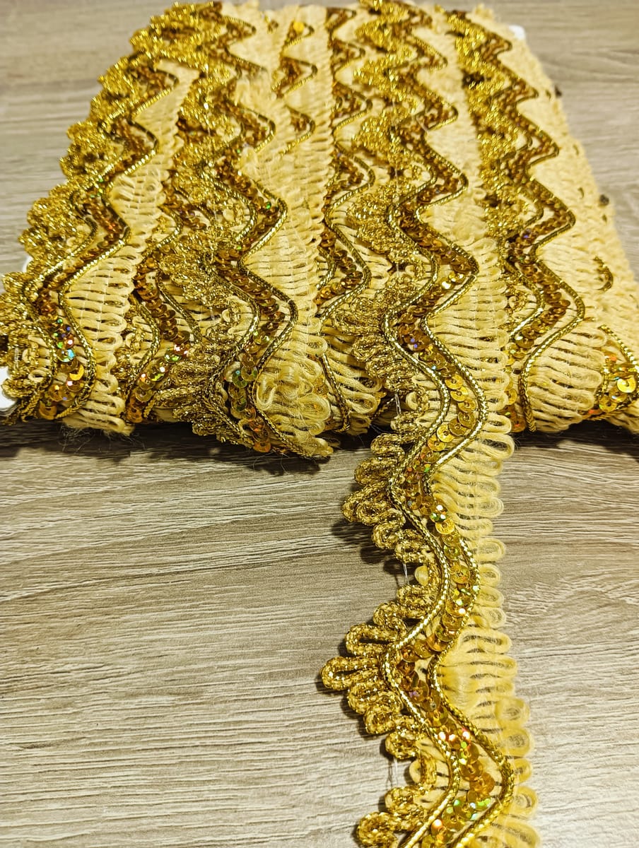 Тази изискана декоративна гарнитура комбинира бяла текстилна основа с богато украсен Златист мотив. Вълнообразната дантела е очертана със Златист конец, а вътрешността ѝ е изпълнена с плътно подредени холограмни пайети, които придават интензивен, преливащ блясък.
